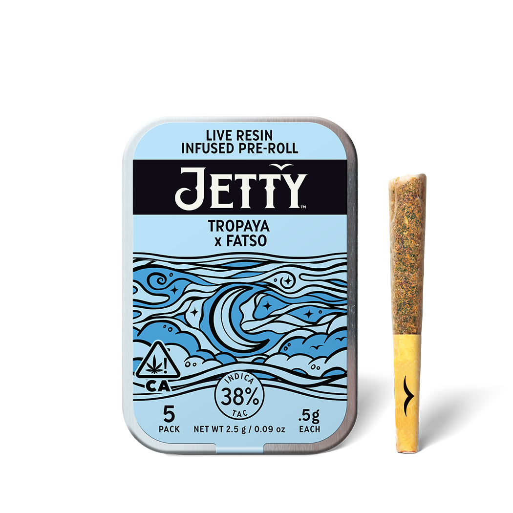 GMO lays down that garlic-fueled funk while Papaya Burger smothers it in tropical sweetness. This heavy indica hits earthy and skunky, then cruises into full-body chill mode. We start with OCal Certified (comparable-to-organic) top-shelf bud, selected for its flavor and potency. An infusion of live rosin comes next, made in-house using just ice, water, heat, and pressure. The result is unique pairings that bring out intense flavors and effects from complementary flower and hash terpene profiles. It's a full-spectrum, full-body high that delivers. Top-shelf bud. Curated flower and oil pairings. Supercharged Potency. Find your flavor with Jetty Pre-Rolls.