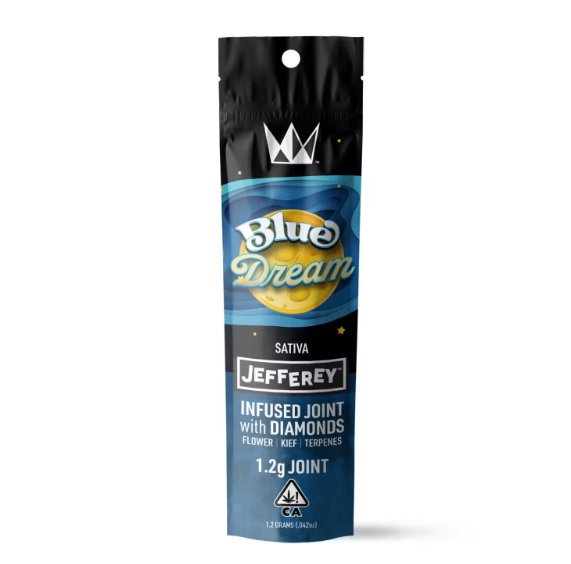 The single Blue Dream Jefferey Infused Joint has kaleidoscopic effects with a rich, hazy palate. Crafted for discerning individuals with an elevated tolerance, this 1.2g Sativa-leaning joint is produced from our perfectly cured Premium Flower, loaded with Live Resin Diamonds, dusted with kief from our Top Shelf Flower, and enriched with a subtle coating of all-natural terpenes. Always fresh and flavorful, the effect of this Blue Dream Infused Joint is nothing short of exhilarating.