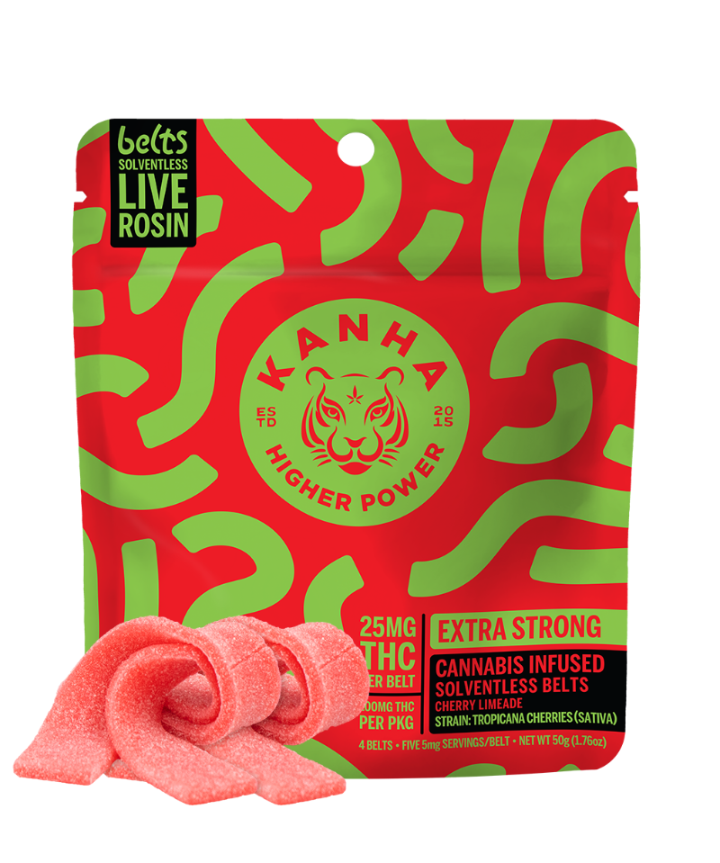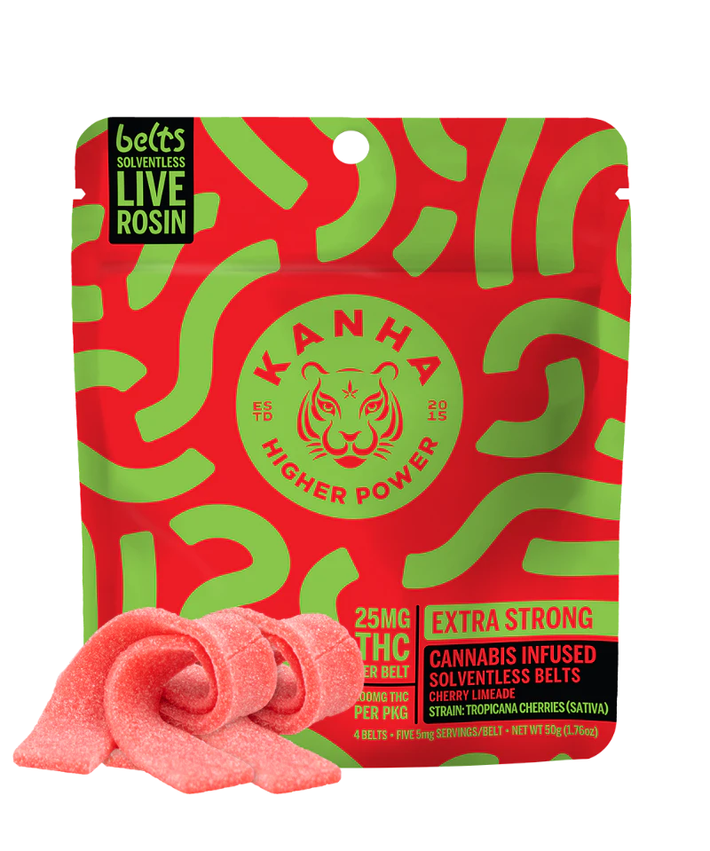 *25mg THC per belt/100mg THC per package* Zing into action with our Cherry Limeade Belts, a punchy Sativa blend crafted for the thrill-seekers. Made with Tropicana Cherries solventless live rosin for a zesty, cerebral effect. Instructions: Eat 1 serving.
