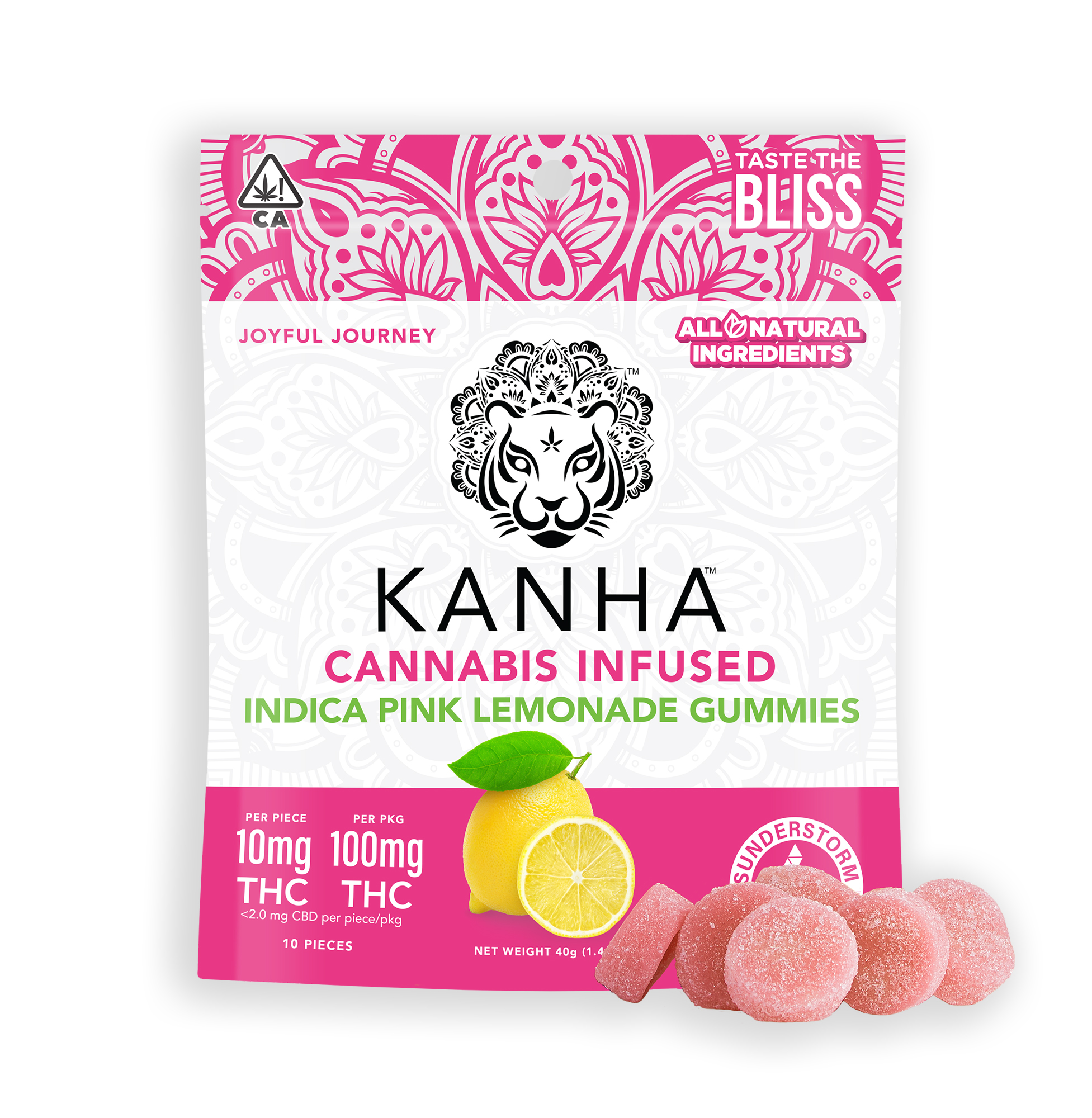 Kanha gummies are made with all-natural ingredients, coloring, and flavoring. Each gummy is infused with the highest quality cannabis oils to provide the most consistent, safe experience on the market. Our Pink Lemonade gummies are sour yet sweet and made with indica terpenes, which induce a calm and relaxed state of mind.