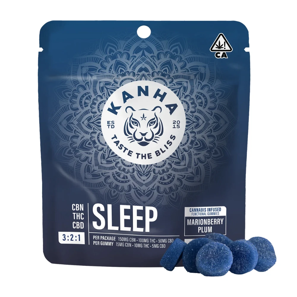 150mg CBN x 100mg THC x 50mg CBD per bag* Dreams are sweeter with our Marionberry Plum 3:2:1 SLEEP blend. Formulated with CBN, THC, CBD, enhanced with antioxidant rich goji berry and sweetened with honey which contains tryptophan, these sleep gummies gently relax you while melting away the day's stress for a deep, restorative slumber. Instructions: Eat 1 gummy. Onset starts around 5-15 minutes. Wait 60 minutes for full effect. Keep in a cool, dry place. Avoid temperatures over 75°F. Ingredients: Tapioca Syrup, Cane Sugar, Water, Gelatin, Agar, Locust Bean Gum, Carnauba Wax, Natural Flavor, Citric Acid, Malic Acid, Natural Color, VESIsorb Nanotechnology, Natural Indica Terpenes **Buy any 3 Kanha 100mg THC Edibles for $50 + Taxes**