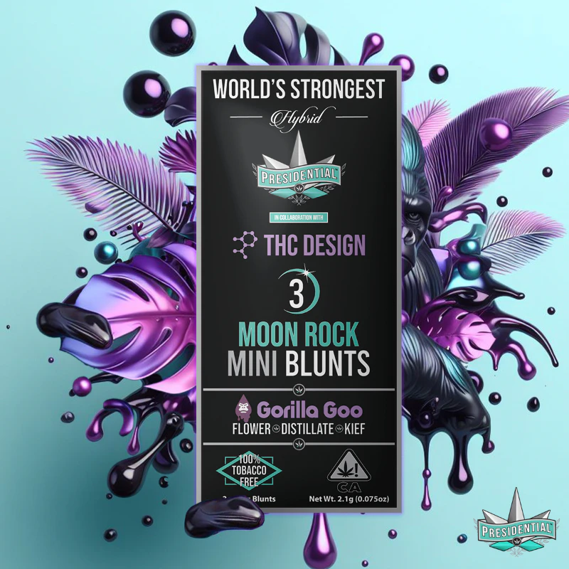 Your Presidential Moon Rock Blunts consist of estate grown, single sourced flower cultivated by the award-winning THC Design. The flower is then INFUSED with premium distillate, using Presidentials proprietary infusion process that enables us to permeate the flower to the stem. Finally, it is coated in the highest quality kief, creating the slowest burning, most potent Moon Rocks on the market! Our blunts are ground and rolled in 100% tobacco free wraps for your enjoyment!