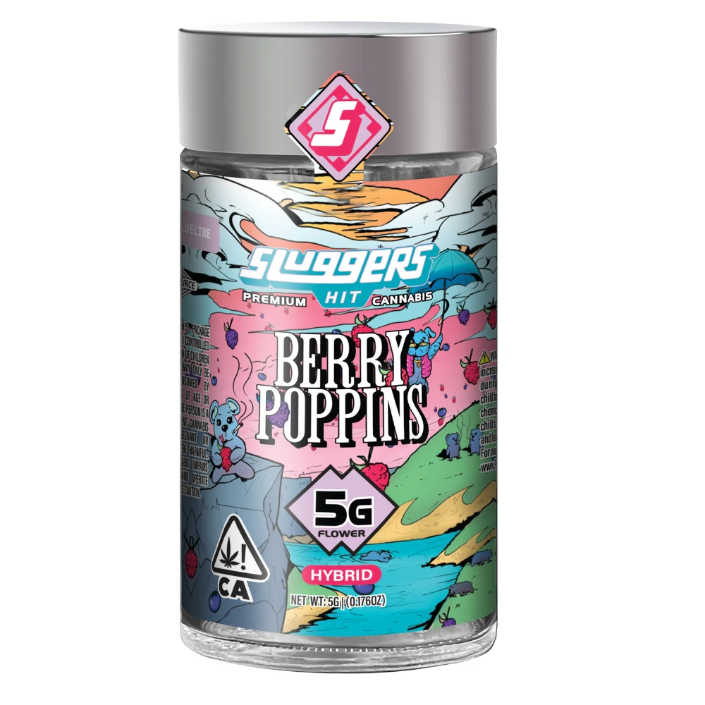 Sluggers Berry Poppins is a hybrid cannabis strain offered by Sluggers Hit, a California-based brand known for its premium, collectible cannabis products. Sluggers Hit ensures top-tier quality through meticulous cultivation practices. Their 5g flower is hand-trimmed and sealed in high-quality glass jars to preserve freshness and potency