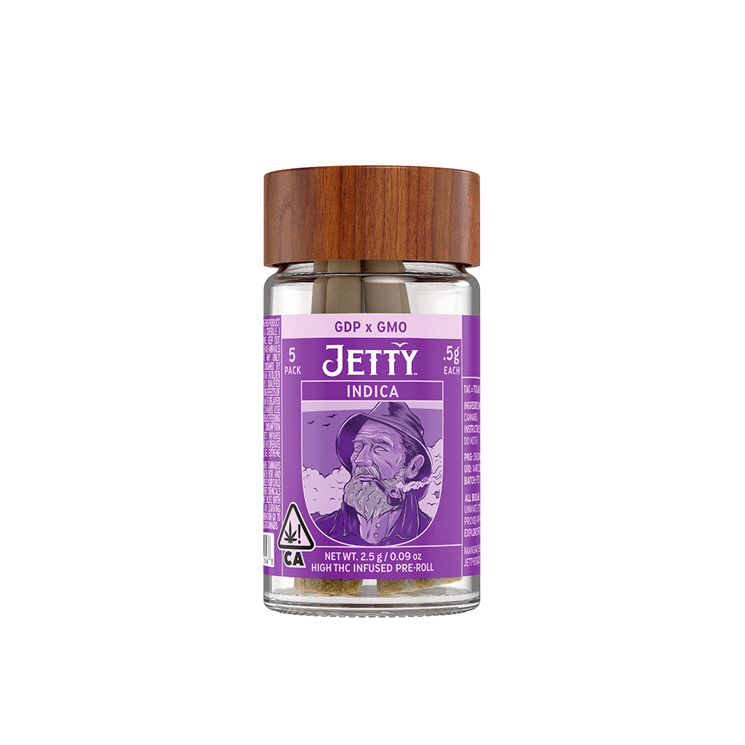 GDP x Purple Haze kicks off with Purple Haze's heady, creative lift before GDP steps in with that classic NorCal couch-lock—earthy, berry-sweet, and perfectly unbothered from start to finish. We start with OCal Certified (comparable-to-organic) top-shelf bud, selected for its flavor and potency. An infusion of live rosin comes next, made in-house using just ice, water, heat, and pressure. The result is unique pairings that bring out intense flavors and effects from complementary flower and hash terpene profiles. It's a full-spectrum, full-body high that delivers. Top-shelf bud. Curated flower and oil pairings. Supercharged Potency. Find your flavor with Jetty Pre-Rolls.