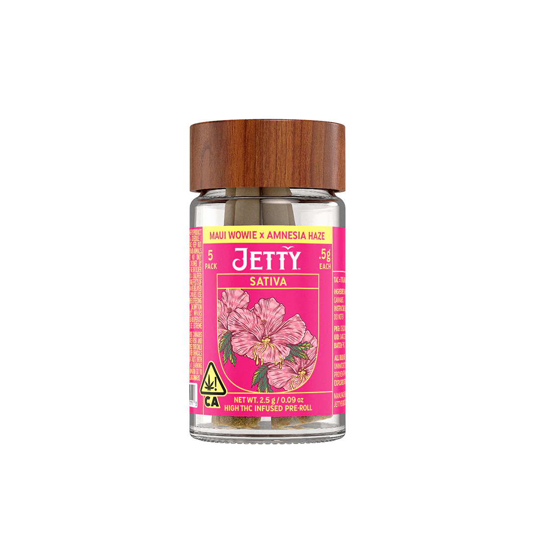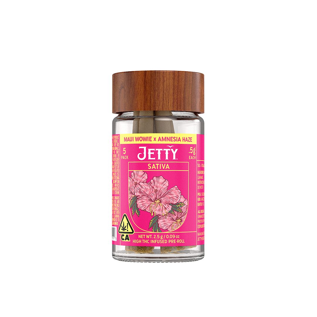 A West Coast classic mashup—Maui Wowie delivers high-THC tropical energy, while Blue Dream layers in dark berry flavor and that famously smooth, clear-headed high. We start with OCal Certified (comparable-to-organic) top-shelf bud, selected for its flavor and potency. An infusion of live rosin comes next, made in-house using just ice, water, heat, and pressure. The result is unique pairings that bring out intense flavors and effects from complementary flower and hash terpene profiles. It's a full-spectrum, full-body high that delivers. Top-shelf bud. Curated flower and oil pairings. Supercharged Potency. Find your flavor with Jetty Pre-Rolls.