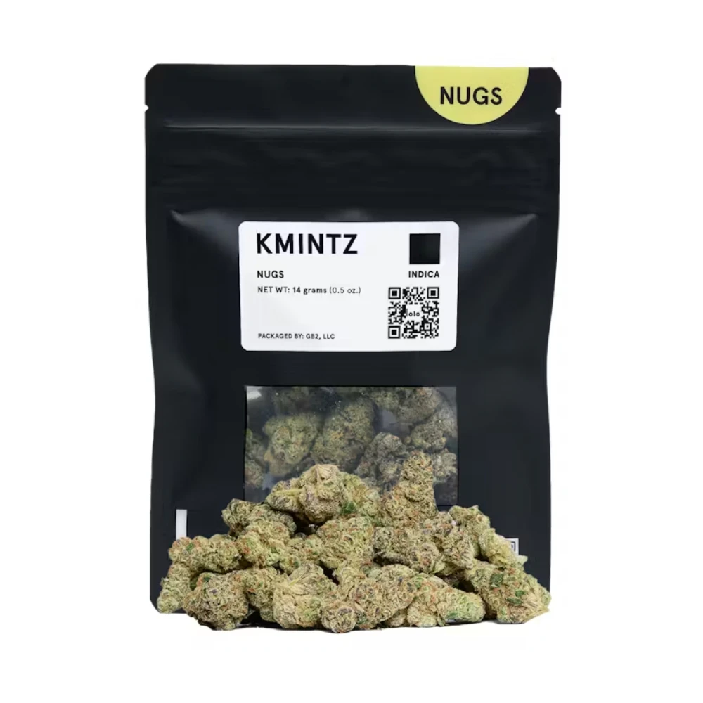 Kmintz is a rich indica bred from Bubba Kush × Animal Mints, prized for its bold flavor and deeply calming effects. The taste is crisp and layered, featuring cool mint, fresh coffee, and earthy cookie dough, while the aroma brings together sweet woods, spiced espresso, and a sharp mint finish. Visually dense, frosty buds shimmer with crystal trichomes over forest-green hues.