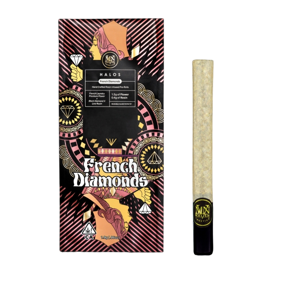 Our Premium Rosin-Infused Pre-Rolls are handcrafted with Top-Tier, Strain-Specific Flower, and the finest solvent-less Concentrates. This curated blend radiates a sophisticated flavor profile - an aura of the highest caliber. Experience the epitome of sophistication with French Diamonds, a classic coupling of our award-winning FKAFL flower, and our Black Diamond X Live Rosin. A seasoned, lavender-rich inhale offers hints of mint, accompanying a mélange of earthy, diesel undertones that blend into a delicate sweetness. A touch of lemon adds a lovely acidity to this lavish, nuanced smoke, making this a must-try for those who value the finer things in life.