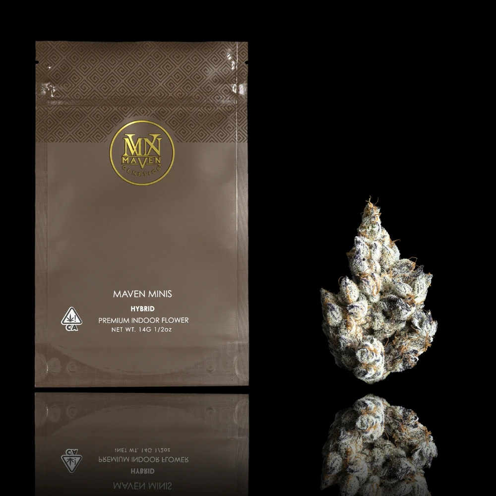Born from two of Maven's most legendary strains, this award-winning cultivar doesn't just inherit greatness — it reveals it. Prizm lends precise terpene architecture and radiant resin production, while FKAFL brings density, depth, and unmistakable aromatic intensity. The buds arrive sculpted and substantial, glazed in luminous frost. Broken apart, the aroma opens sharp. Citrus peel moves over gas and sweet funk before widening into pine resin and bright tang with a restrained floral lift
