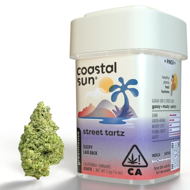 Sweet Tartz is a genetic cross of Guava Tart and Street Guru. It offers a unique, gassy, and musty aromatic profile with subtle hints of baked pastries. When consumed, users note this cultivar induces a mellow calmness that gradually deepens into a profoundly cozy state, potentially helpful in supporting a restful sleep session.