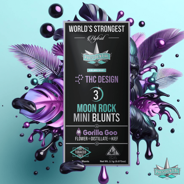 Your Presidential Moon Rock Blunts consist of estate grown, single sourced flower cultivated by the award-winning THC Design. The flower is then INFUSED with premium distillate, using Presidentials proprietary infusion process that enables us to permeate the flower to the stem. Finally, it is coated in the highest quality kief, creating the slowest burning, most potent Moon Rocks on the market! Our blunts are ground and rolled in 100% tobacco free wraps for your enjoyment!